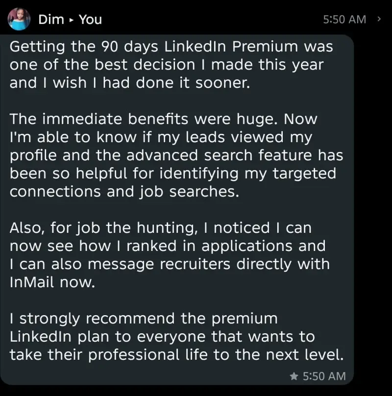 The LinkedIn Premium offer is a one-time access to 90 days of LinkedIn Premium Business Subscription.